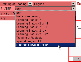 For selecting the group of kanji you want to learn, please first select the appropriate filter as shown below. Then a new line in the menu will be shown with different options for the training.